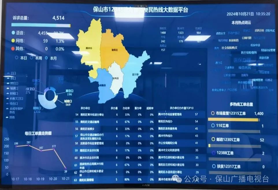 2023年12月,保山市12345热线平台完成整体迁移和优化升级,扩充了话务席位作为发展储备,将话务区和配套功能区进行合理划分,并对平台进行智能化升级改造,数据分析大屏与省平台可视化数据对接,并同步改版升级,助推数据分析应用。