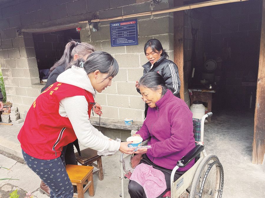 志愿者给老人送汤圆。