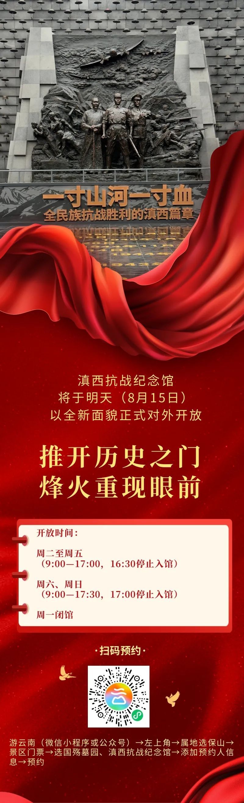 推开历史之门,烽火重现眼前——于2013年8月15日正式落成并对外免费开放的滇西抗战纪念馆,是腾冲抗战文化展示的重要窗口与依托。其年接待观众均达140余万人,是集展览、收藏、研究、瞻仰、宣传教育等多重功能的抗战纪念馆,全面再现了辉煌的滇西抗战历史,是研究和弘扬滇西抗战历史、缅怀先烈、祈愿和平、对外交流、统一战线建设的重要场所,先后被评为:全国重点文物保护单位、全国爱国主义教育示范基地、国家国防教育示范基地、国家级海峡两岸交流基地、全国第二批红色旅游经典景区、第二批中国20世纪建筑遗产、国家级AAAA级景区、国家二级博物馆。