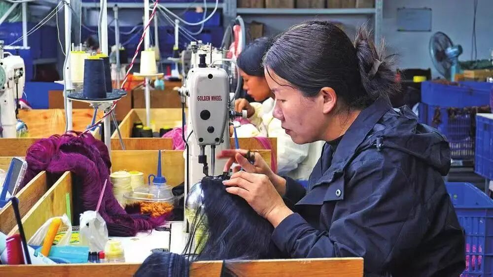 当地群众在腾冲市电子商务仓储物流服务中心假发生产车间务工。 杨艳鹏 摄