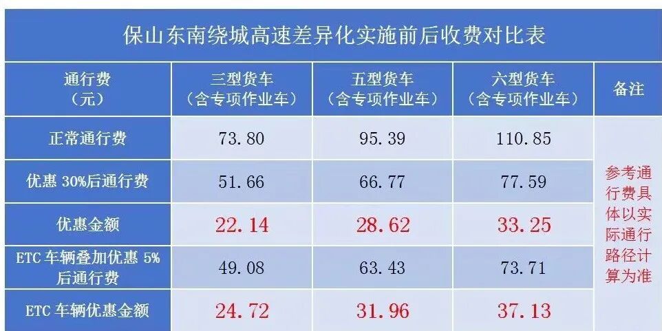 具体福利:在此期间,对通行保山东南绕城高速的3类货车、5类货车和6类货车(包含专项作业车)给予30%的通行费优惠。使用ETC支付的车辆可叠加享受5%优惠。