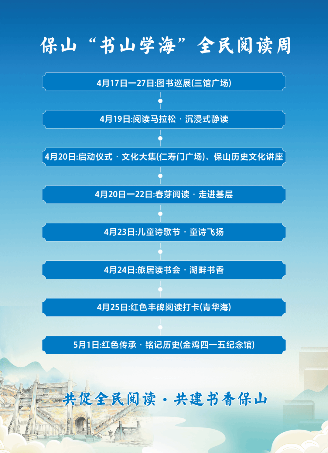 4月17日—5月1日,保山“书山学海”全民阅读周,我们以书相约,以读相伴,阅尽辉煌,还看今朝!快来加入我们,一起让阅读成为保山最动人的风景!