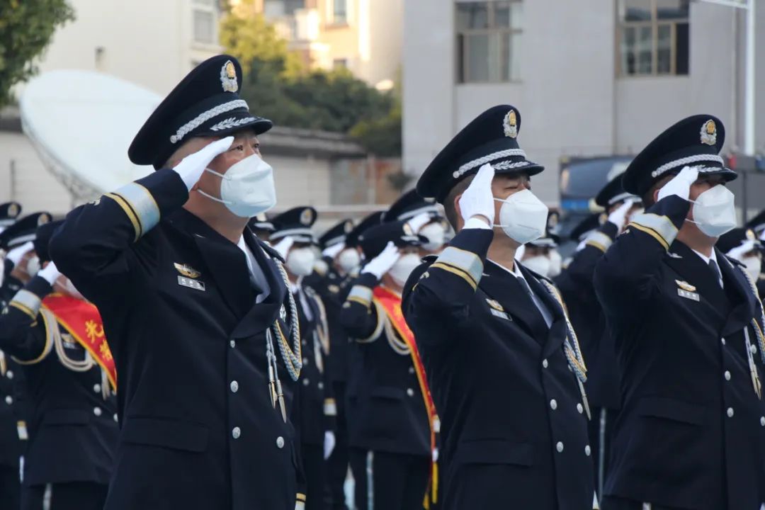 上午9时,在雄壮的国歌声中,鲜艳的五星红旗迎着朝阳冉冉升起,身穿警礼服、警容严整的民警们向国旗敬礼并高唱国歌,表达对党、对祖国、对人民、对公安事业的无限忠诚和热爱。随后,伴随着《中国人民警察警歌》激扬的旋律,中国人民警察警旗也冉冉升起,全体民警面向警旗庄严宣誓,一句句誓言铿锵有力,一声声承诺掷地有声,表达了民警们坚定的从警信念。