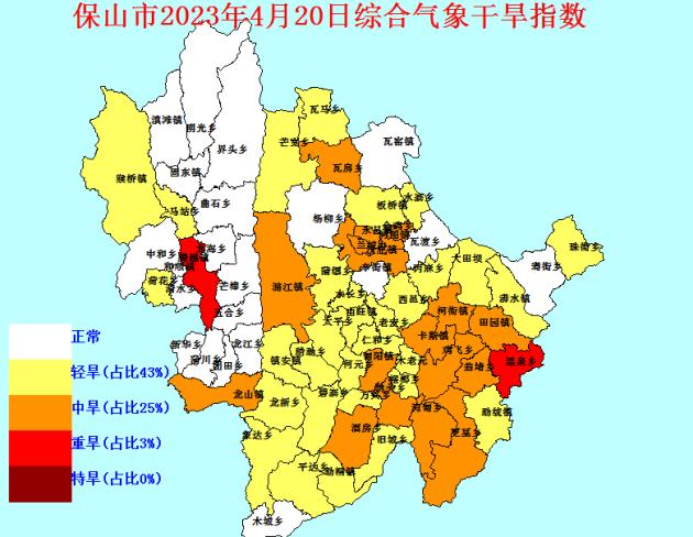 此次降水天气过程的出现,使得保山大部地区的旱情得到一定缓解或缓和,其中腾冲市大部、龙陵县北部、隆阳区西北部过程累计雨量普遍达到了10~25毫米,旱情得到明显缓解,其他区域过程雨量不足10毫米,施甸南部边缘及昌宁的中部及以南地区累计降雨量不足5毫米,该区域仍维持中等强度的气象干旱。