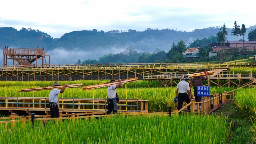 走进龙江弄岗稻田公园,只见蓝天白云下,白鹭翻飞、溪流潺潺、稻谷逐渐泛黄,丰收的气息越来越浓。工人们正在美丽的稻田公园里修栈道、搭舞台,各项工作有序开展,届时以“学用‘千万工程’ 礼赞丰收中国”为主题的文艺演出将在这里举行。舞台搭建负责人王建怀告诉记者,舞台设计主要融合了丰收节这一主题,结合龙江万亩梯田的美景,通过技术支持,力求达到舞台和万亩梯田的有机融合;沉浸式的文艺演出创作和排练正在有序开展,演员们也在加班加点地排练。