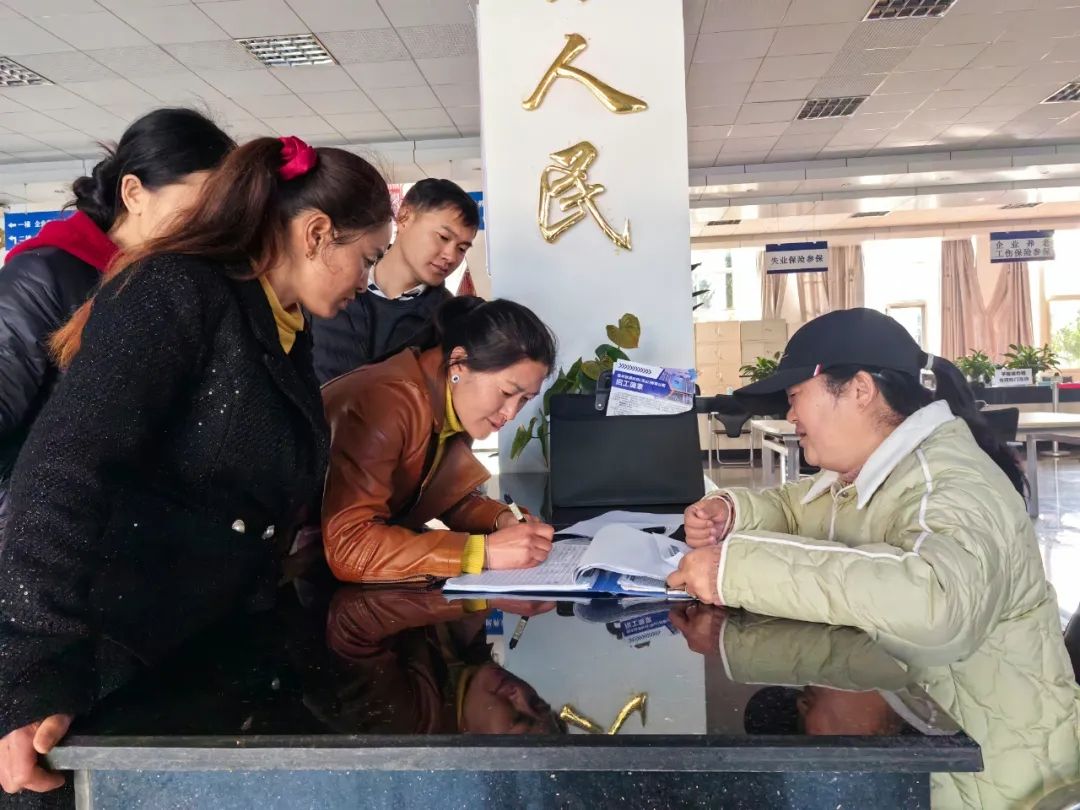 在昌宁县人力资源和社会保障局办事大厅内,工作人员正在为务工人员办理报到登记,并耐心讲解注意事项。
