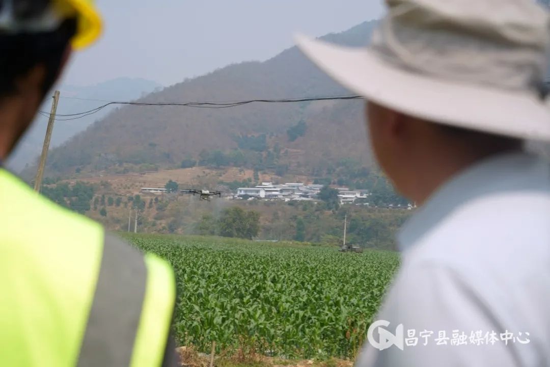 在大城村的玉米田边,技术人员将调配好的肥料倒入无人机的容器中,随着螺旋桨的一阵“嗡嗡”声,无人机在操控手的操作下迅速升空,灵活地在玉米田上方飞行、盘旋,肥料均匀地洒落在玉米叶面上,短短几分钟,无人机就完成了数亩玉米田的喷洒,整个过程快捷高效。