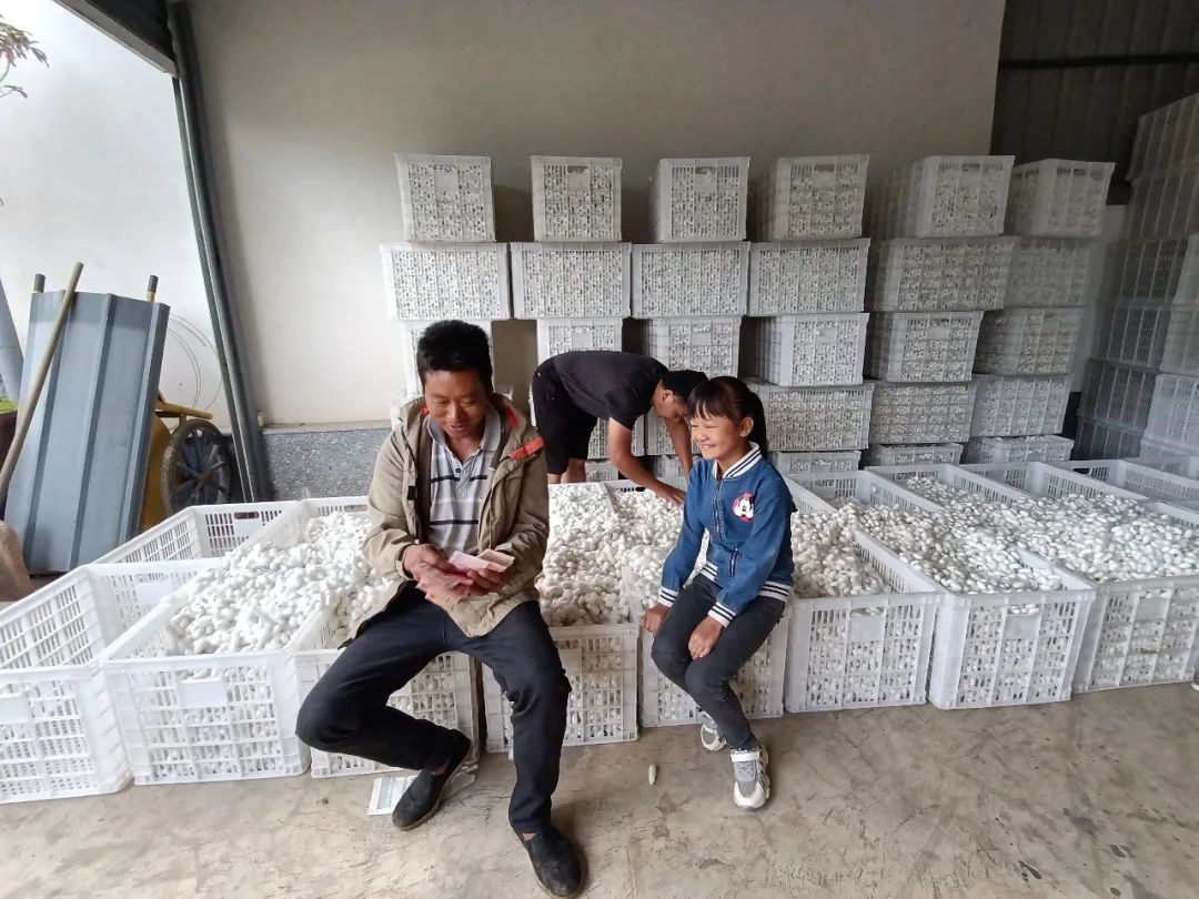 如今的永福村,田间是望不到边的“绿浪”,蚕房是堆成山的 “白雪”,这片土地上的人们,正用最朴素的劳作,让“春采桑、夏养蚕” 的传统,结出实实在在的致富果。“光卖蚕茧赚的是辛苦钱,把蚕丝做成被子,价钱能翻几番” 这是永福村第一批“吃螃蟹”的村民们,在江浙考察后带回的“新想法”。几年前,5位村民自发组队南下取经,白天在丝绸厂跟着师傅学煮茧、缫丝、拉丝,晚上在宿舍里记笔记、画流程,3个月的“学徒期”结束时,每人带回3本写满了的笔记本。学成归来后,他们带头办起了村里第一批蚕丝加工厂。“老字号” 蚕丝被厂坚守“一茧一丝不掺假”的传统工艺,从周边村寨收茧加工,年产820床蚕丝被,5万多斤蚕茧在这里变成柔软的被褥,通过县城实体店走进千家万户.“永福丝绸”则玩起了新花样,年轻的负责人带着员工拍短视频、开直播,把蚕丝被的制作过程搬上屏幕,一年卖出1600床;10万斤蚕茧加工的产品通过快递发往武汉、南京,最远还卖到了新疆。