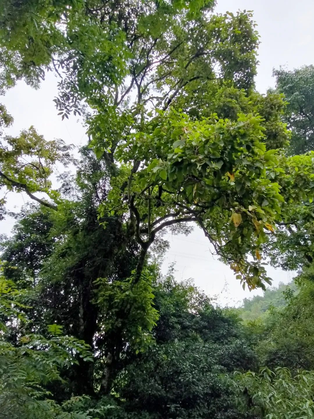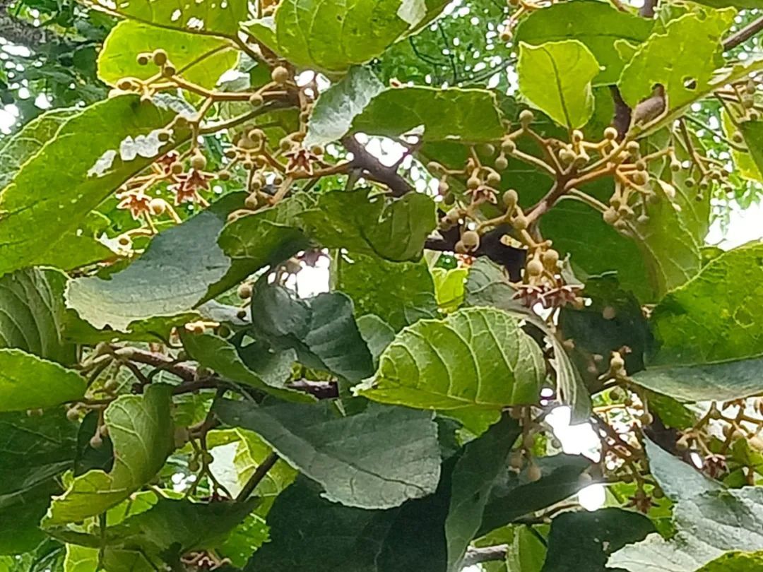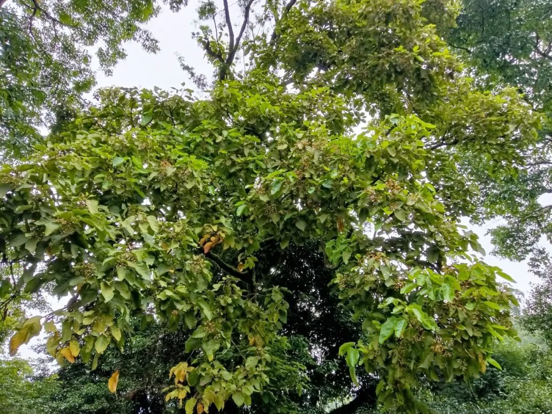 这株野生滇桐生长在海拔1600多米的针阔叶混交林中。从外形上看,树形高大,分三叉,苍劲古老,根基发达壮硕,整株枝繁叶茂,生长十分旺盛。发现时,恰逢滇桐满树花开,滇桐花属聚伞花序腋生,一支花柄有花2至5朵,萼片5片,花期8月,果期10-11月。经林草部门技术人员测量,这株野生滇桐根部周长100多厘米,树高约18米,冠幅投影近2亩,树龄估计百年以上。