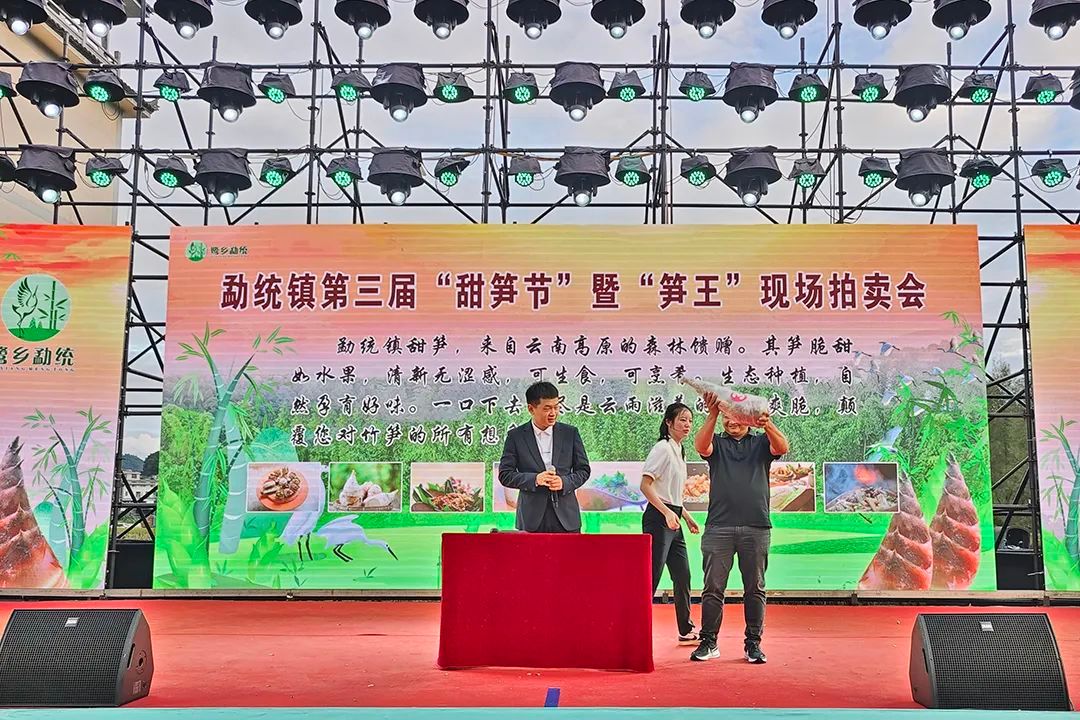 当天下午14:30,“甜笋节“重要活动—— “笋王争霸赛”在集镇评选区顺利举行,来自全镇9个村的代表们带着精心挑选的甜笋陆续抵达现场,由专业技术人员组成的评审团,从新鲜度、外形完整度、甜度、单株重量等多维度对参赛甜笋进行细致评定。经严格评选,共5株甜笋脱颖而出,其中来自大河村王家寨的甜笋以综合品质最高荣获本届“笋王”称号。当晚开幕式现场,5株获奖甜笋公开拍卖,最终总成交额达4360元,全部捐赠用于勐统镇公益事业。一号“笋王”更是以1360元高价落槌,将全场氛围推向高潮。
