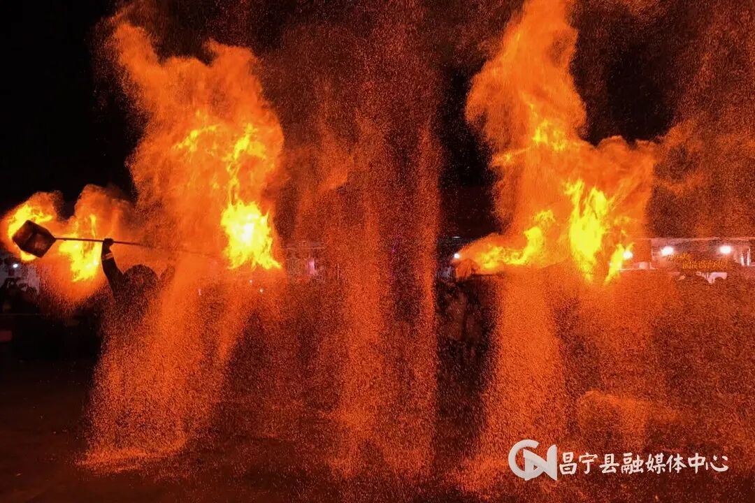 文艺演出环节精彩纷呈,歌舞、器乐表演轮番上阵,本土特色打歌互动点燃全场热情,机器狗表演更添科技趣味,为现场观众带来了一场视听盛宴。晚会间隙,非遗打铁花表演如期上演,千点万点金花绽放夜空,配以传统锣鼓声,尽显非遗文化的磅礴气势;非遗耍火壶传承人手持火壶翩翩起舞,火光流转间展现着昌宁民俗的独特魅力,引得现场掌声不断、欢呼连连。