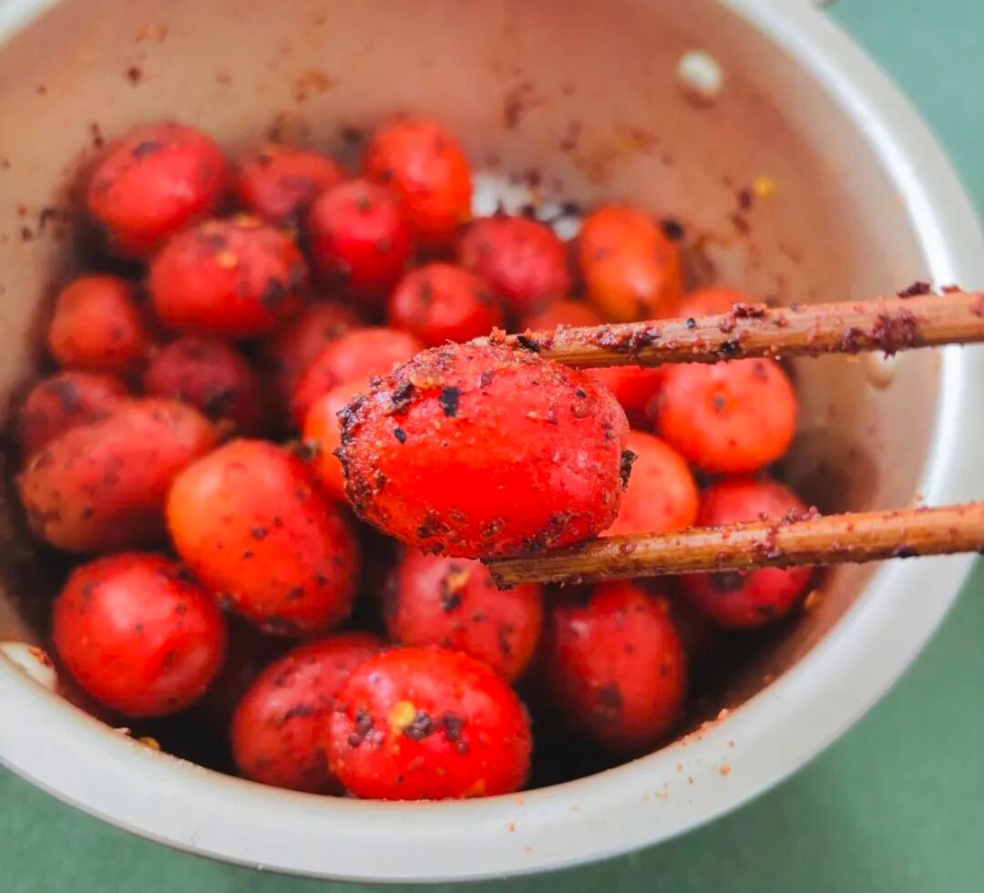 在施甸,羊奶果更是当地特色吃法的“灵魂食材”,“盐巴辣子拌水果”是施甸大街小巷、校园周边随处可见的特色小吃,羊奶果则是其中最受欢迎的品类。地道的拌羊奶果以糊辣子面为核心调料,将新鲜果实洗净后,撒上盐巴、拌入金黄的糊辣子,红果与调料充分交融,色泽诱人、口舌生津。入口后,酸爽汁水在齿间迸发,搭配盐味与糊辣子的焦香,口感层层递进,吃起来酣畅淋漓,成为施甸春天最具代表性的味道。