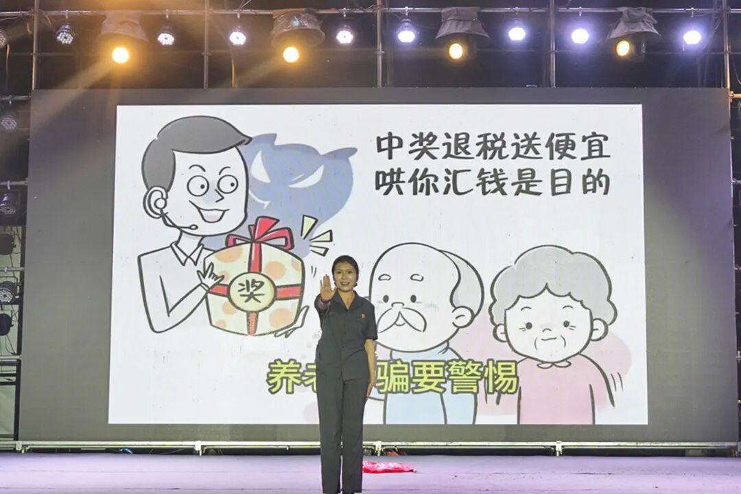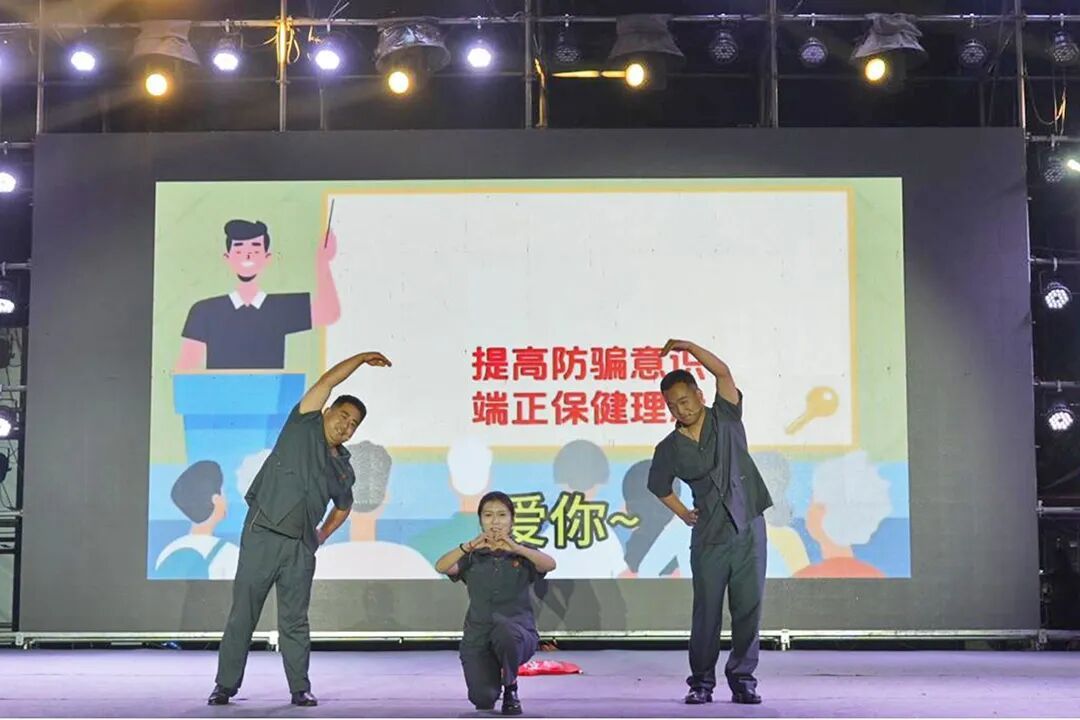 “如果你遇上天上掉馅饼,那一定就是诈骗陷阱……”“常常说你爱听的话肯定别有用心,千万不要轻信……”在反诈改编版《爱你》歌舞表演中,干警们以轻快灵动的舞姿、熟悉悦耳的旋律,将养老诈骗核心提醒融入朗朗上口的歌词,直白揭露诈骗分子的惯用伎俩,让现场观众在轻松欢快的氛围中,牢记各类诈骗防范要点,深刻认清诈骗犯罪的现实危害。