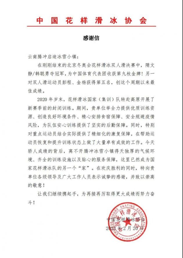 2020年岁末,花样滑冰国家(集训)队转赴高原开展了新赛季前的封闭训练。期间,贵单位举全力提供优质训练资源、创造良好环境条件、精心安排食宿保障、安全规避疫情风险,为队伍安心训练提供了坚实的后勤保障。同时,特别对重点运动员结合实际提供了精细化的康复保障,在帮助运动员恢复和提升训练状态上做了大量卓有成效的工作。今天骄人成绩的背后,离不开腾冲冰雪小镇得天独厚的气候环境、齐全的训练设施以及贴心的服务保障,这里已然成为国家花样滑冰队的另一个“家”。在欢庆胜利的同时,特向贵单位各级领导及广大工作人员表示诚挚的感谢,并致以崇高的敬意!