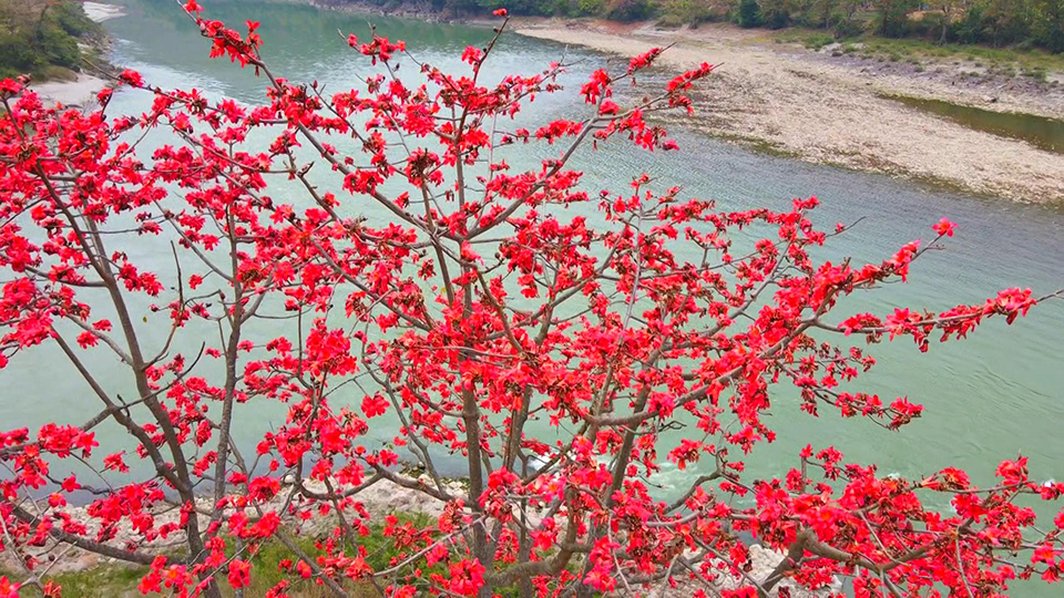 初春,施甸怒江河谷两岸的木棉花悄然绽放、火红如炬、俏立枝头,一片片绚丽的艳红色在春风中悠然摇曳、赤焰灼灼,染红了江畔,向人们报告着春天的讯息。