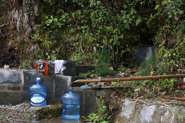 在他的指引下,我们动身前往同心泉取水,途中还偶遇了一位自称喝了这泉水20年的村民携着两桶水满载而归。细细打听了一番才知道,同心泉是尖山的一眼天然山泉水,从前人们只觉得口感清冽,无杂质,送检之后才知道,这水里面含有硒等多种矿物质,是山泉水中的上品,饮之有益。此后来这里取水的人更是络绎不绝,有时甚至还需要排起长队。