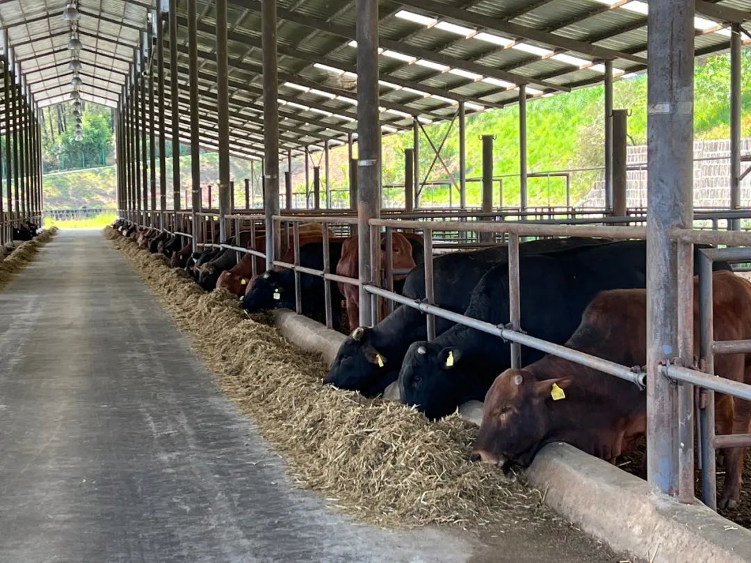 走进鹏欣集团腾冲鹏腾牧场,空气中就带着一股青草酸味的青储饲料,走进覆着灰色彩钢瓦的牛棚里的肉牛都被合理规划地安排在不同的区域,远远的还能听到了牛“哞哞”的叫声。