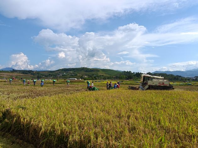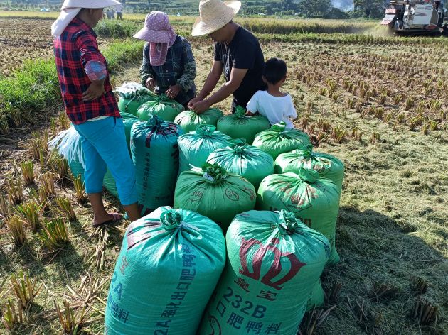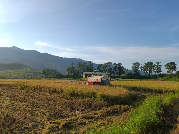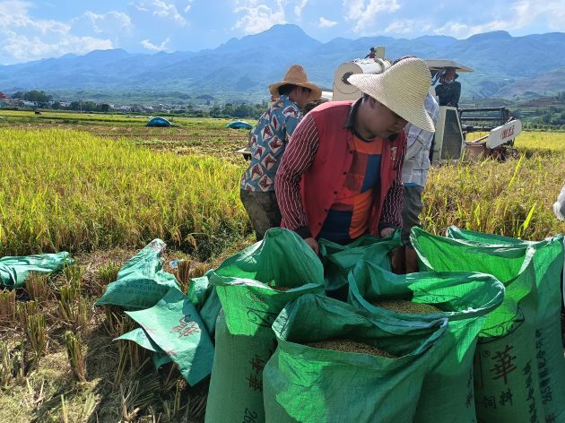 走进芒赖社区坝子,随处可见田间地头村民们正忙于收割水稻的身影。微风一过,一阵阵清香扑面而来。水田里的稻谷在阳光照射下披上了重重金黄,稻浪滚滚,稻香袭人。趁着晴天,群众正抓住这好天气开始收割。在收割前几天,数十辆收割机已停放在芒赖坝子,只要稻农们一声令下,师傅们就马上进田开始收割。