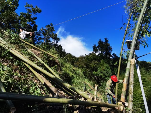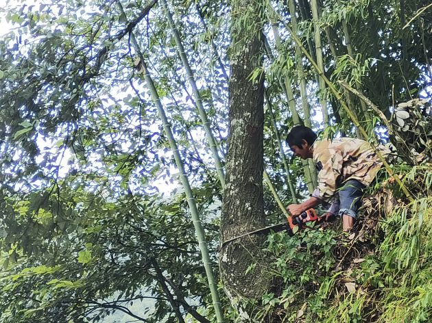 临危而惧。镇宝村是一个地处高黎贡山腹地呈“S”型的小山村,家家户户靠山而居,整个村庄依山而建,历来地质脆弱、地质灾害频发。生于斯长于斯的杂树、乔木、龙竹却顺势疯长,它们成为一方自然生态风景的同时,也成为村庄民房、道路设施、人畜安全的隐患。在村庄里,有的头重脚轻形成“高危”,有的根浅欲坠让人“临危”。“上边的树又高又粗,离我家很近,真怕倒下来砸到我们,与他们家协商,他们家说没办法。”村民范绍波一年多前就反映了这个情况,一家三代人为这事一直恐慌。“好不容易房子盖好了,太阳能支好了,就怕上边的大竹蓬砸下来。”残疾户范绍海也为这事担惊受怕。类似隐患在整个村已成普遍现象。