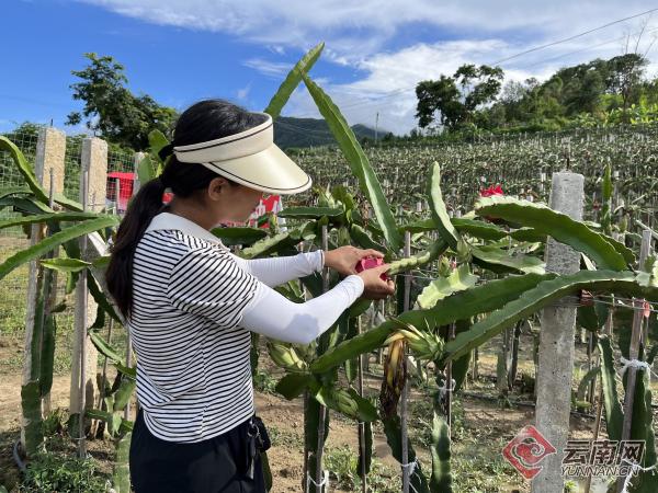 这两天,昌宁县卡斯镇邑新果园种植的火龙果相继成熟。认养人穆仲轩从手机微信群看到,自己认养的10株火龙果已经陆续成熟,便来到果园采摘。
