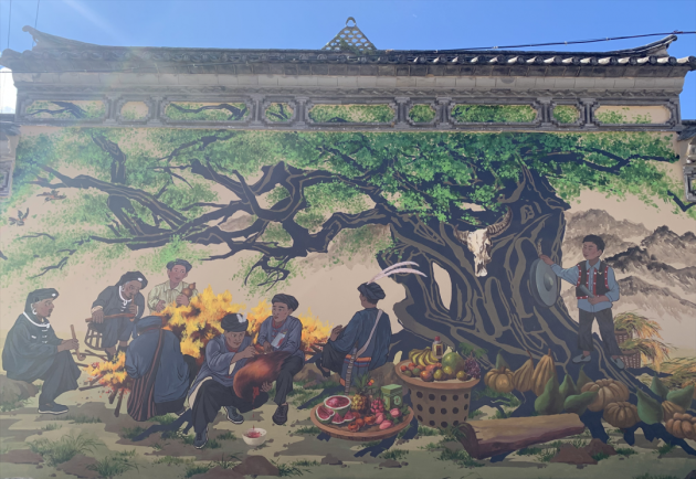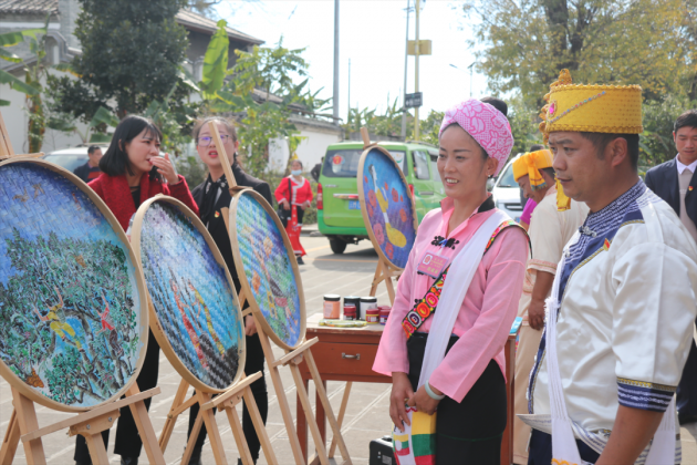 荷花镇民团社区坝派自然村农民画画家贾明安在村子里创作了一些民俗、历史、生产生活等方面的画作,吸引了很多的游客。“从党的十八大以来,政府对乡村这一块的重点扶持,让我们老百姓发展了很多自己的事业,日子蒸蒸日上,大家幸福感倍增。”贾明安边说边作手上的画。