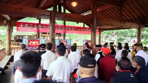 在木老元布朗族彝族乡,当地干部群众一大早就聚集在哈寨村打歌场的活动室里,挥动着手中的党旗、国旗,激情唱响《没有共产党就没有新中国》,等待着大会的开幕。上午10:00大会正式开始,大家聚精会神地观看了开幕盛况,静静聆听了习近平同志的报告,报告让布朗族群众心潮澎湃,引发了强烈反响。