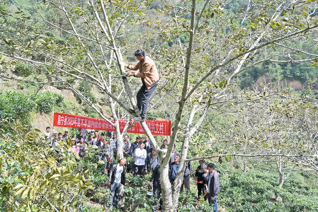 昌宁县坚持林长发力,明确各级林长林草产业“责任林”,在加大示范基地建设的同时,实行“果农点单、我来服务”的科技服务模式,着力在经济林果“良种良法”上下功夫。2023年,通过积极向上争取项目扶持,采取“疏密+施肥+树干涂白+整形修剪+病虫害防治”等措施,在4个乡镇建设核桃低效林改造示范基地17465亩,在5个乡镇建设核桃提质增效示范基地22535亩,在2个乡镇建设澳洲坚果提质增效示范基地2500亩。针对农户核桃、澳洲坚果肥水科学管理、树体管理、病虫害防治等技术缺乏问题,在进行实用技术培训的同时,加大乡村技术骨干的培养,2023年以来共开展经济林丰产栽培技术骨干培训16期,培训人员1600人。