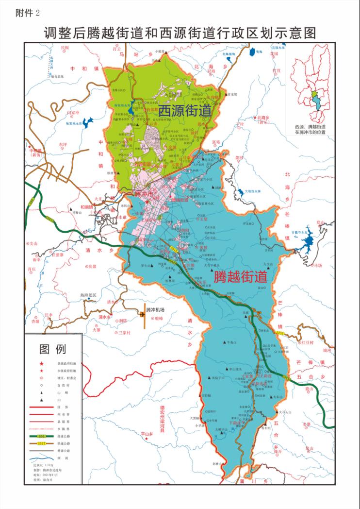 一、同意调整腾冲市腾越街道现行政区域,以大盈江中心线为界一分为二析置分设腾越街道和西源街道;大盈江中心线以北新设立西源街道,以南沿袭保留腾越街道。