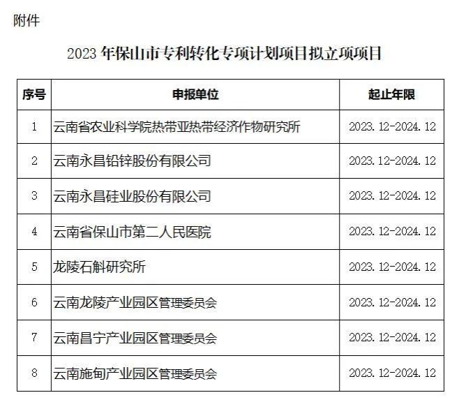 根据《国家知识产权局办公室财政部办公厅关于进一步做好专利转化专项计划政策实施及相关资金使用管理的通知》(国知办发运字〔2023〕21号)、《云南省知识产权局云南省财政厅关于印发云南省实施专利转化专项计划助力中小企业创新发展工作方案(2021—2024年)的通知》、《云南省市场监督管理局关于组织好州市专利转化运营促进项目的通知》(〔2023〕129)和《保山市市场监督管理局关于组织申报2023年专利转化专项计划项目的通知》要求,经申报单位申报,各县(市、区)市场监管局审核推荐、专家组评审、市市场监管局审定,现将2023年保山市专利转化专项计划项目拟立项项目进行公示,公示期为5个工作日(2023年12月20日—12月27日)。